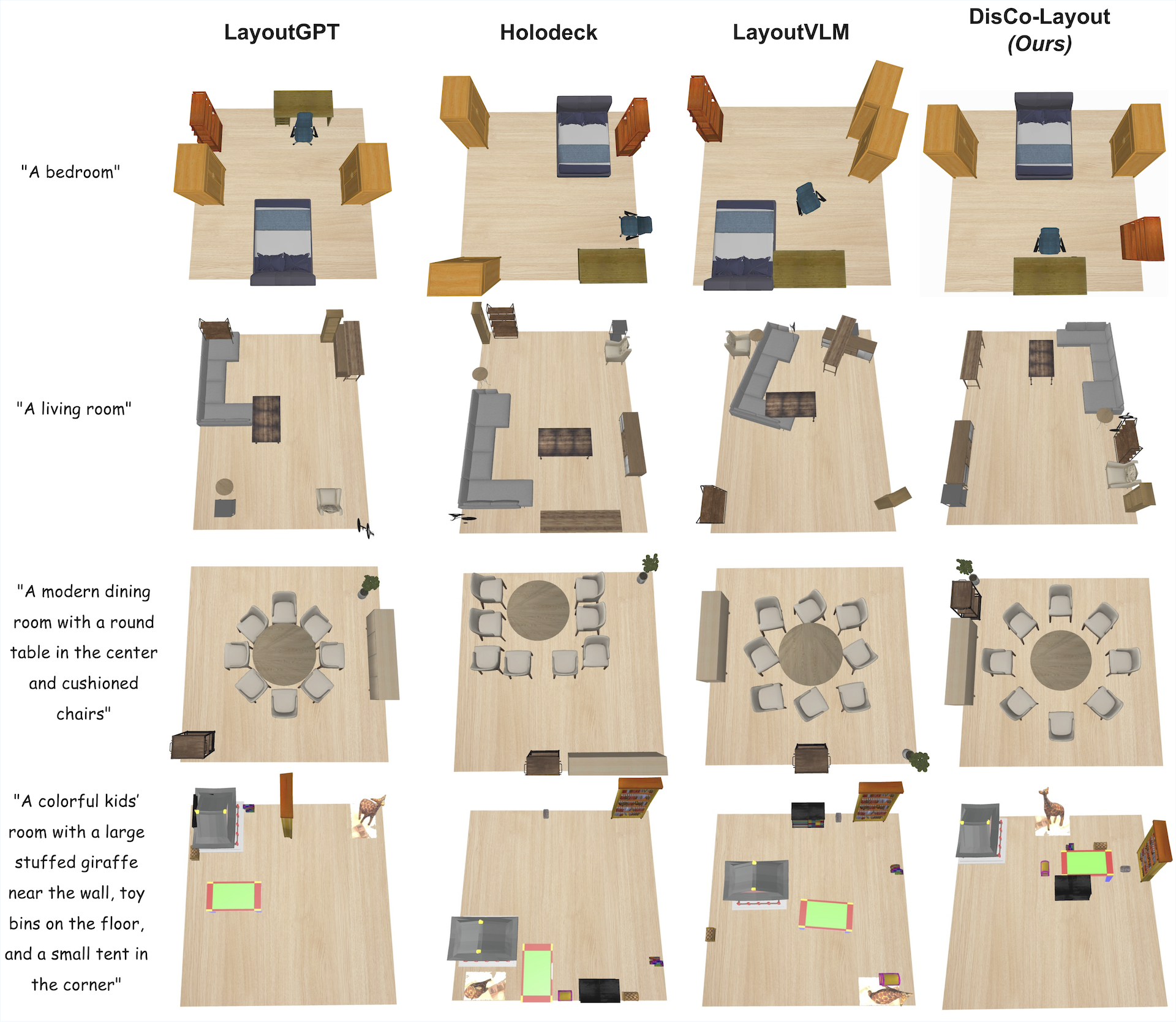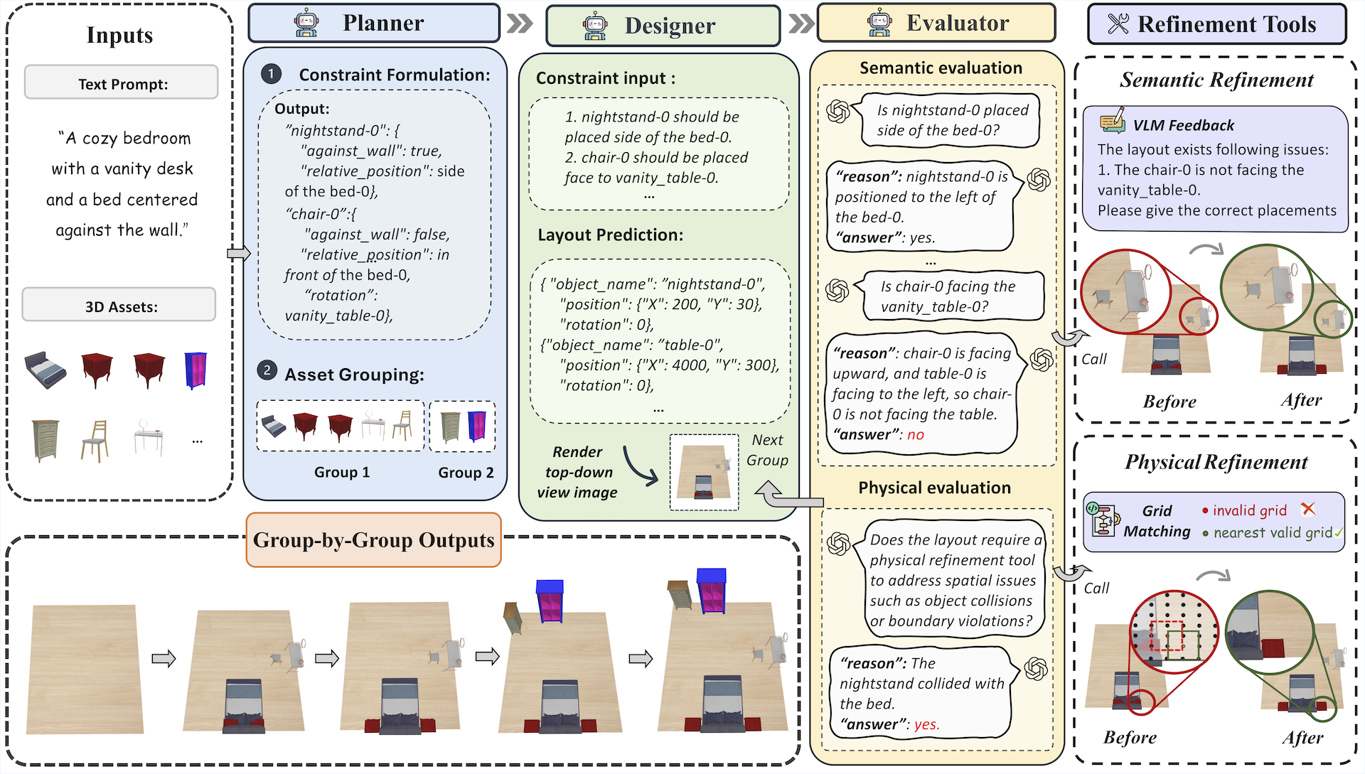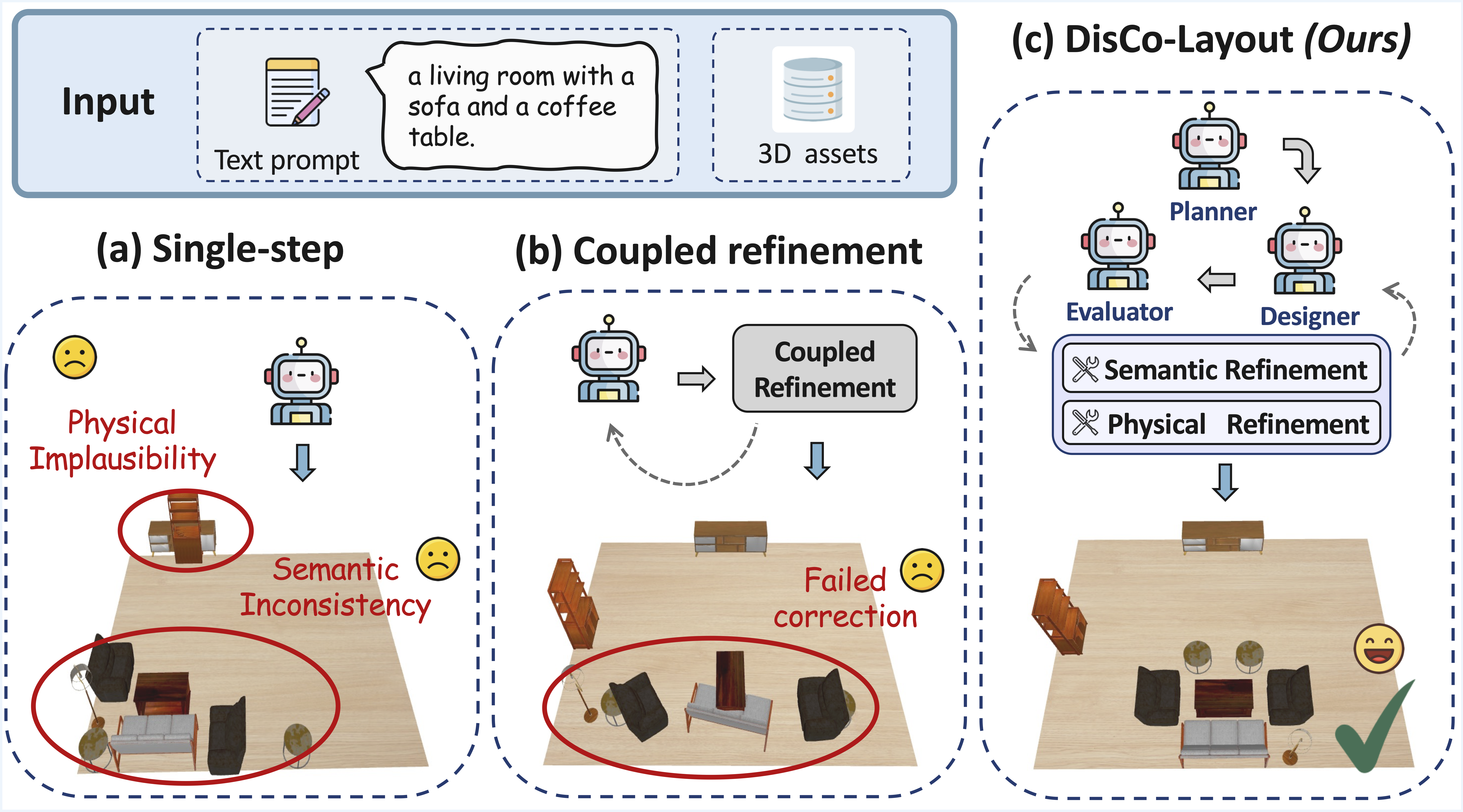 3D indoor layout synthesis is crucial for creating virtual environments. Traditional methods struggle with generalization due to fixed datasets. While recent LLM and VLM-based approaches offer improved semantic richness, they often lack robust and flexible refinement, resulting in suboptimal layouts. We develop DisCo-Layout, a novel framework that disentangles and coordinates physical and semantic refinement. For independent refinement, our Semantic Refinement Tool (SRT) corrects abstract object relationships, while the Physical Refinement Tool (PRT) resolves concrete spatial issues via a grid-matching algorithm. For collaborative refinement, a multi-agent framework intelligently orchestrates these tools, featuring a planner for placement rules, a designer for initial layouts, and an evaluator for assessment. Experiments demonstrate DisCo-Layout's state-of-the-art performance, generating realistic, coherent, and generalizable 3D indoor layouts. Our code will be publicly available.